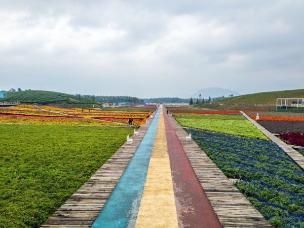 沿着小镇的彩虹路漫步,两边粉的、红的、蓝的花朵分区块有序地出现在我们的眼前,让人应接不暇,远处的丘陵在雾气的笼罩下宛如仙境……
