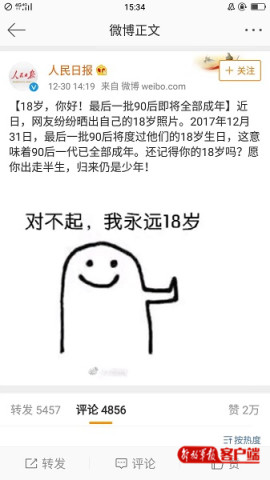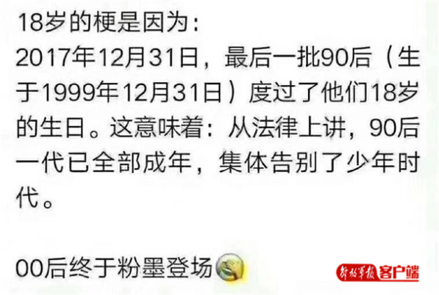 2017年12月31日,生于1999年12月31日的最后一批90后度过了他们18岁的生日。这意味着,从法律讲,90后一代已全部成年,集体告别了少年时代。