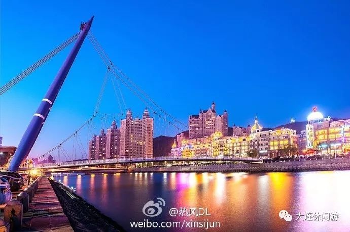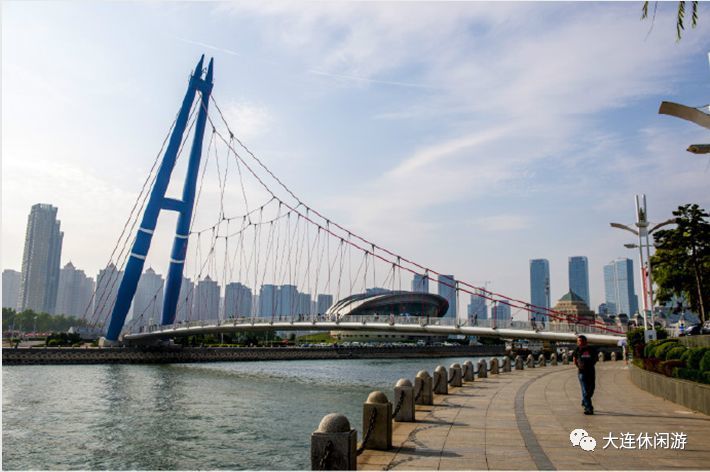 大连挑月桥,位于星海湾广场东南角,横跨马栏河,游客从百年城雕走来,可以从桥上步行到对面进入滨海路西段。
