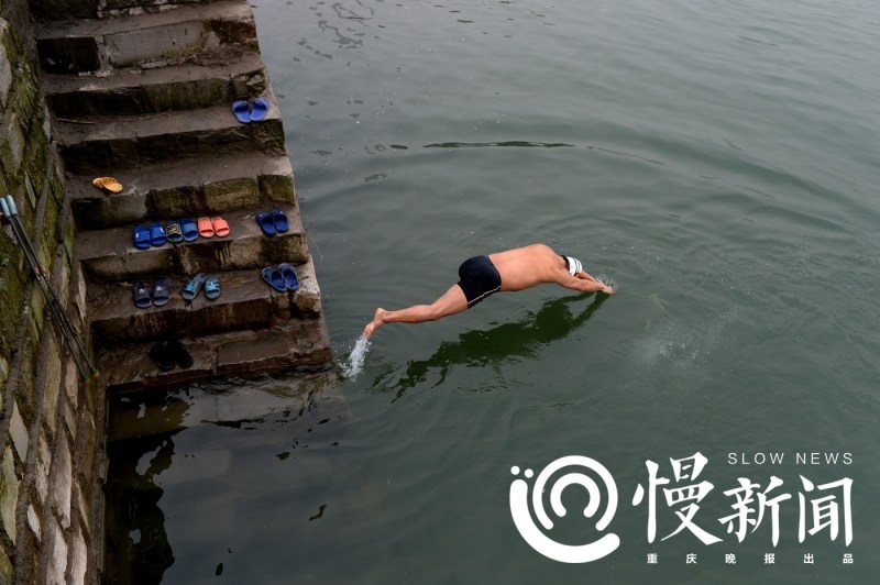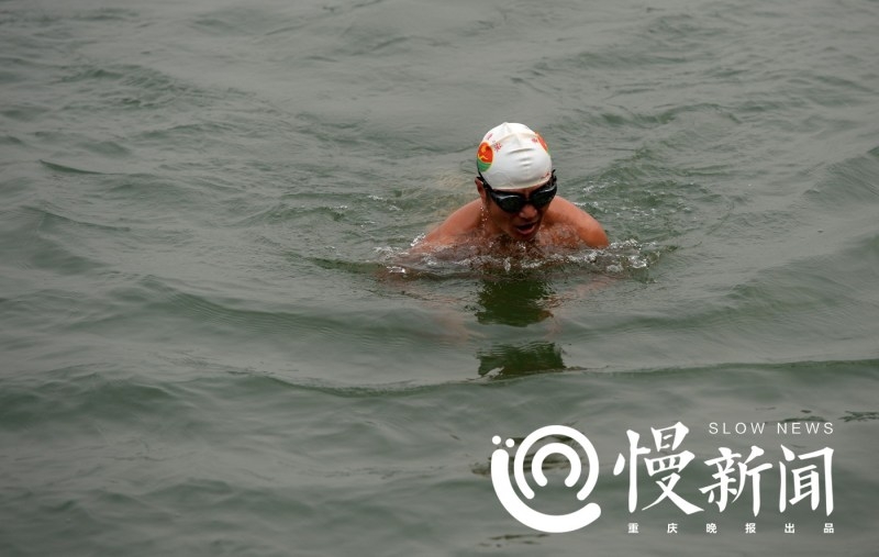 人在江中。64岁的王荣用仅剩的右腿蹬地,奋力一跃,几分钟后,只看到江心一个小白点,那是他的泳帽。