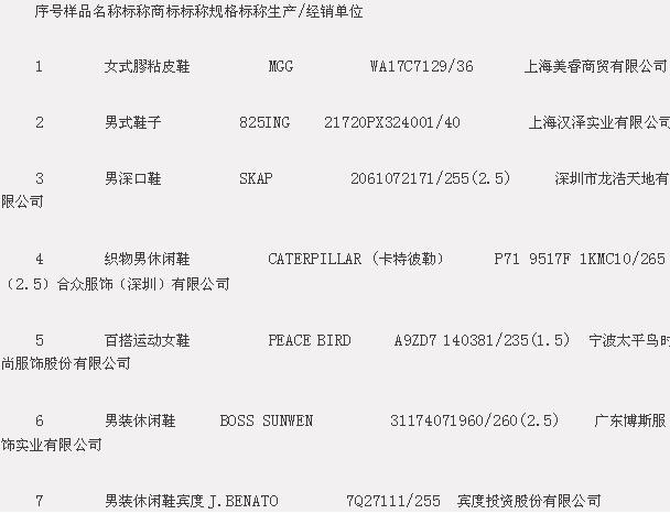 耐折性能是鞋类产品穿着寿命的综合质量指标,标准要求,产品连续屈挠4万次后,不得出现帮面开裂、开胶或裂纹现象。测试结果显示,有7件样品在4万次耐折试验后出现开胶现象,其中包括MGG女式膠粘皮鞋、SKAP男深口鞋、CATERPILLAR (卡特彼勒)男鞋、PEACE BIRD百搭女运动鞋、BOSS SUNWEN男装休闲鞋、宾度J.BENATO男装休闲鞋。