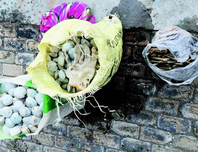 有经验的赶海人大多是潮还未全退去时就动手开挖,直到下午潮涨上来,前后四五个小时,收获以白蛤为主,也有蛏子。拿到附近市场上去卖,白蛤十块钱2斤,一天能挖个百八十斤白蛤,收入也有四五百元。