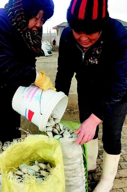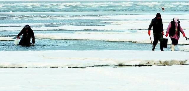 浅海结冰,加上前些天的积雪,想要从海滩上岸,总要有人先趟出一条“冰路”来。尽管穿了水裤、水鞋,戴着手套,赶海人的双手和双脚却不敌刺骨的寒风和冰冻的海水,但“天越冷,赶海的人越少,海货的质量也高”,他们说,“海边儿的人,不怕冷,习惯了!”