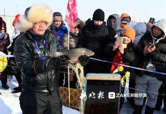 在市总工会松花江冬泳浴场,冬泳运动员不但泳姿优美,还不时与游客击掌相庆。现场颇具特色的冬捕表演,也让游客们领略到北国独特的民俗。