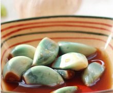 泡腊八蒜用紫皮蒜和米醋,将蒜瓣去老皮,浸入米醋中,装入小坛封严,至除夕启封,蒜瓣湛青翠绿,蒜辣醋酸香溶在一起,扑鼻而来,是吃饺子的最佳佐料,拌凉菜也可以用,味道独特。