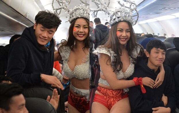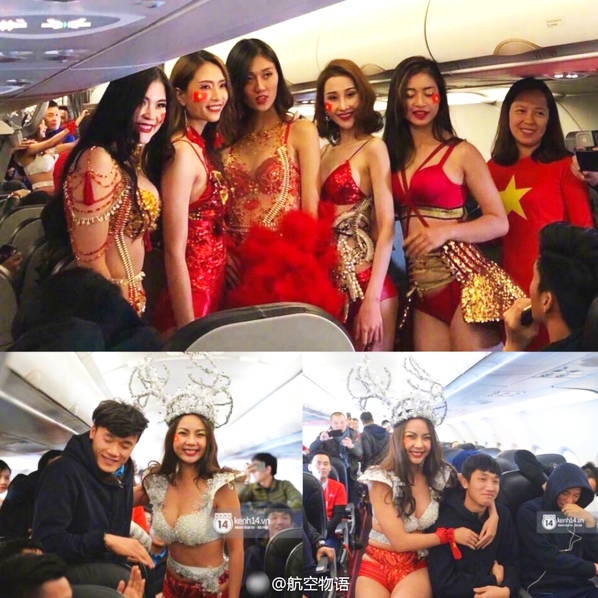 图片显示,这些女“招待”个个短衣热裤,对球员们搔首弄姿、“眉目传情”;还有人强坐在他们身边,要求拥抱合影,令球员们备感尴尬。此外,她们还进行了“热舞”表演。相关照片流出后,恶评如潮。有网友称:“越捷航空此举真是无礼且下作,明摆着是对国家队的冒犯。”还有人表示:“太恶心了,就凭这个以后我也要**越捷。”