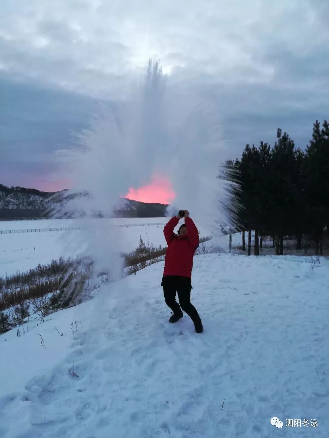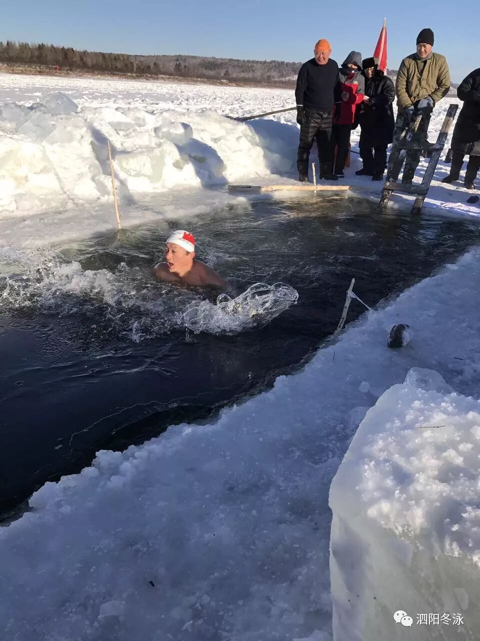 但见广阔的河面上早就被厚厚洁白的冰雪覆盖,我们提前一天请当地村民在冰面上凿开一个长达七米的冰水池。领队张静,队友裘勇、周金虎、叶兆军、沈正林、刘洪芹、王春凤、倪红共8位勇士相继下水冬泳,挑战中国最北冬泳!