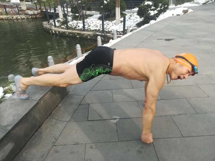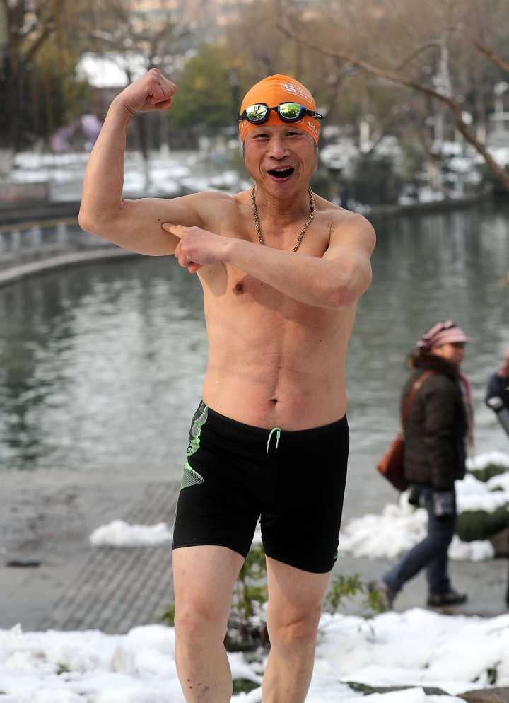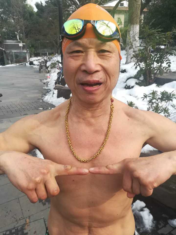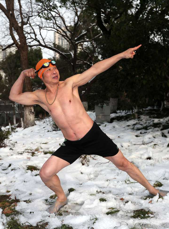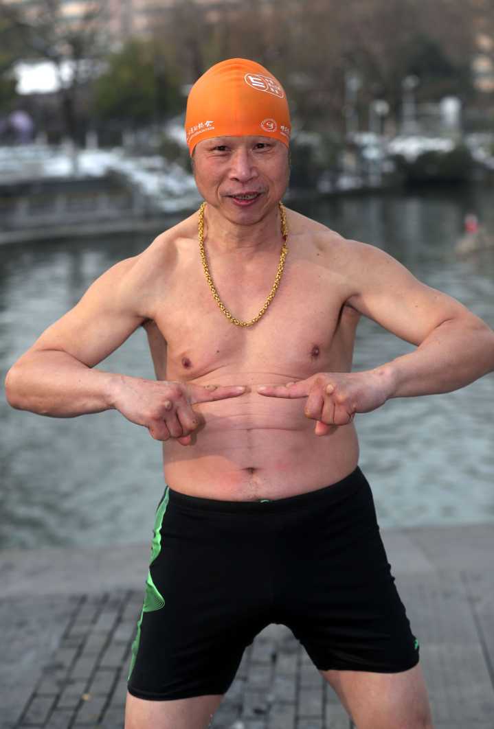 在他们的指引下,记者见到了正在热身的杜国华:只见他脱掉外套,显现出粗壮的手臂和令人羡慕的健硕肌肉,如果不是亲眼所言,根本不像是年近古稀的老人。用温度计实测,室外气温为零下4°,运河公园的水温在6°左右。