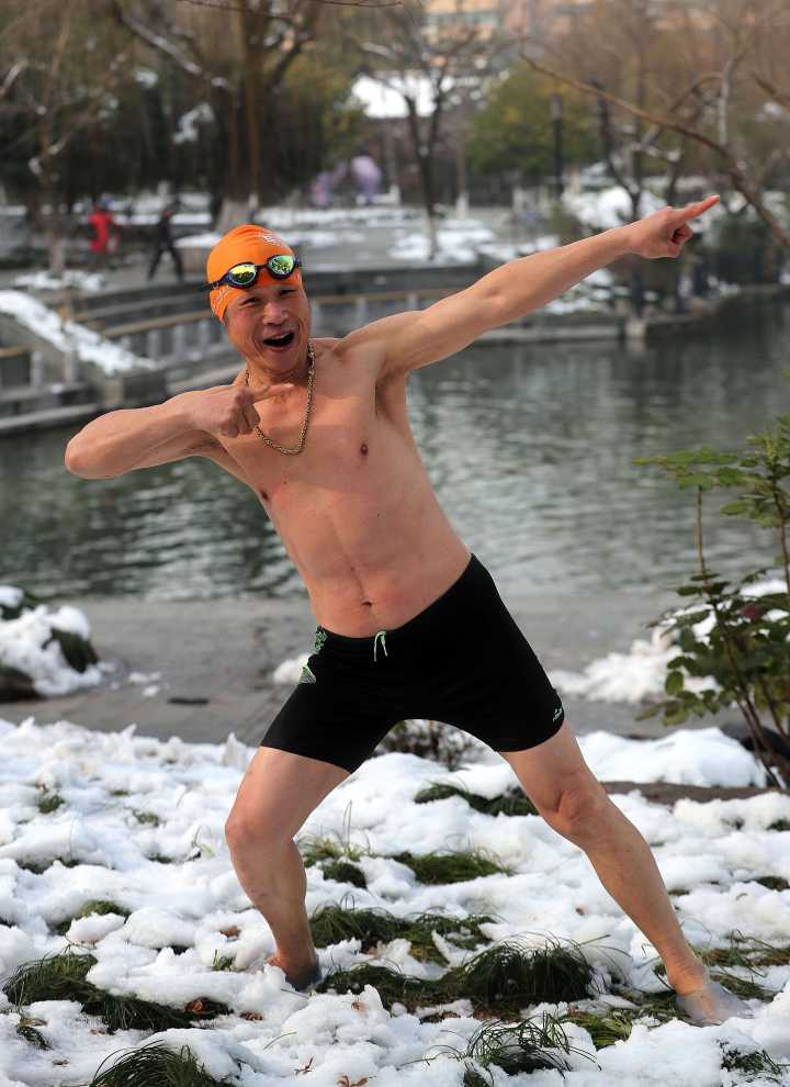 在他们的指引下,记者见到了正在热身的杜国华:只见他脱掉外套,显现出粗壮的手臂和令人称羡的健硕肌肉,根本不像是年近古稀的老人。用温度计实测,室外气温为零下4度,运河公园的水温在6度左右。