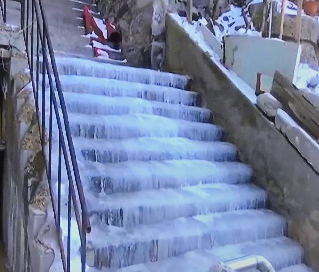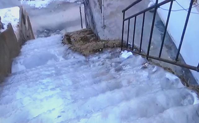 在光凤街16号楼外,一处楼梯已经几乎全部被冰层覆盖。初步估计,冰层至少5厘米厚。