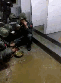 当特警真不容易啊,练出在这种地方也吃得下饭的本领