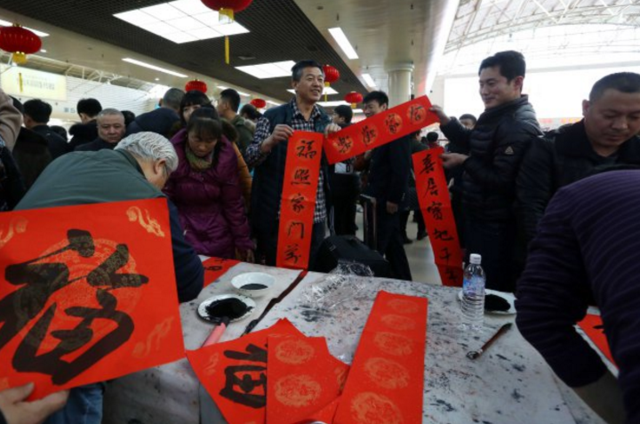 当日,正值农历小年,大连站处处悬挂着红灯笼和中国结,洋溢着浓浓的节日气息,以 " 温馨返乡路、万福送万家 " 为主题的 " 情满旅途 " 三大活动精彩上演。" 把乐带回家 " 由车站团委与大连车站派出所创作表演的乐器快闪、近景魔术、小杂技、抽奖等小型互动节目,吸引着众多旅客的眼球;" 把福带回家 ",由务工人员书写新春寄语,把美好的祝福张贴于新春祈福墙上,而来自铁路系统的书法家现场挥毫泼墨,为过往旅客写春联、送祝福,营造欢乐祥和的节日气氛;" 把爱带回家 " 由市总工会、车站工作人员现场发放面包、矿泉水、水饺等慰问品,大连房产段保洁人员还亲自为务工人员端茶送水,车站公安民警特别为乘车旅客准备了 " 爱心识别贴 ",温暖众多游子的心。他们还联系中国人保设置爱心服务点,为务工人员免费赠送一份保险,让务工人员提前感受 " 家 " 的味道。