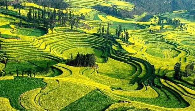 牛街螺丝田则是另一番景象——每到二月,金黄花带一圈一圈绕于山间,远远看去真像是螺丝上的旋纹,是罗平最为独特之地!