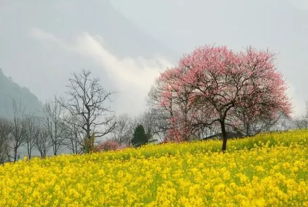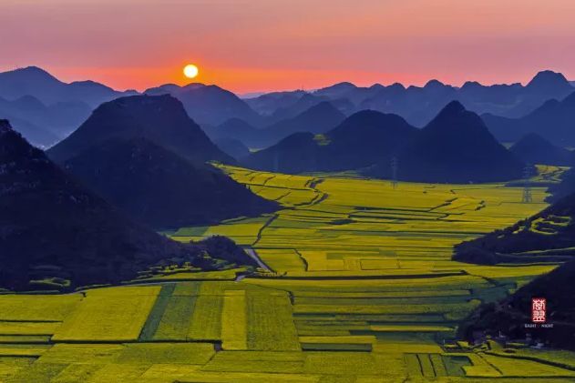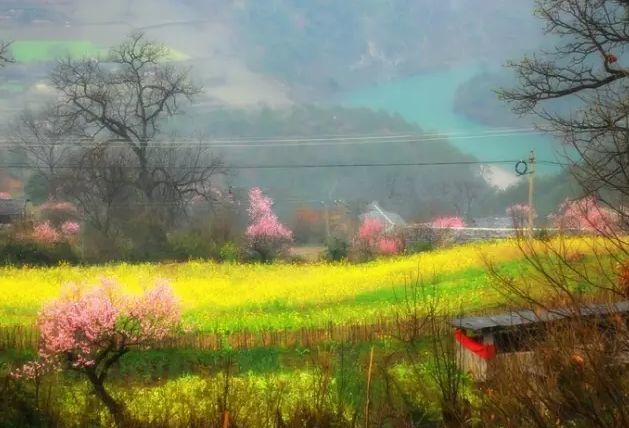 登高远眺,油菜花如金黄色地毯覆盖填充于山间,夕阳斜映或微风轻拂,美得让人宛然入梦。