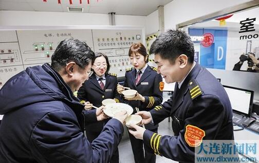 腊月三十,大连地铁集团领导深入地铁车站,向春节期间坚守岗位的一线值班人员送去慰问与关怀,大家一起吃饺子、唠家常,其乐融融。地铁员工表示,节日期间值班,虽然不能与家人团聚,但一定会坚守岗位,确保广大市民出行平安。图为地铁集团领导来到2号线人民广场站车站控制室,给节日期间坚守岗位的值班人员送去饺子。