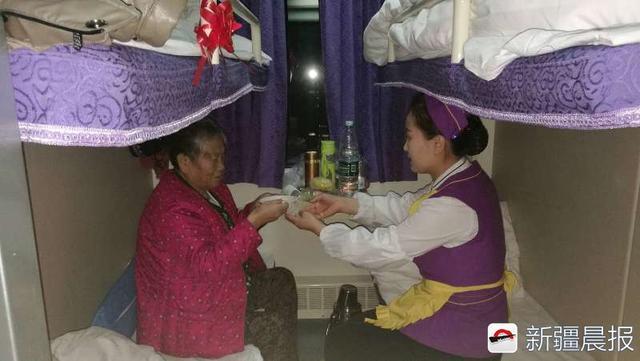 “阿姨,有什么不舒服及时给我们说……”列车长何海斌、乘务员门婷婷每次路过老人铺位也会上前嘘寒问暖。