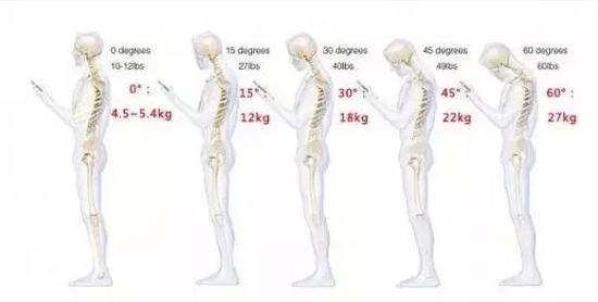 头部弯曲15度,颈椎会增加12千克的压力;