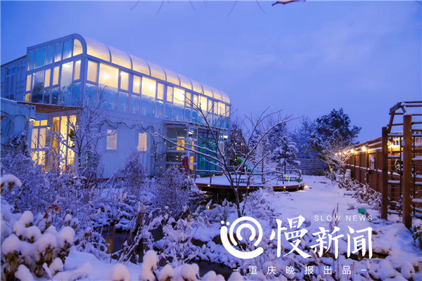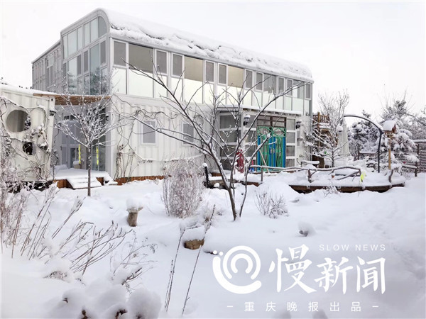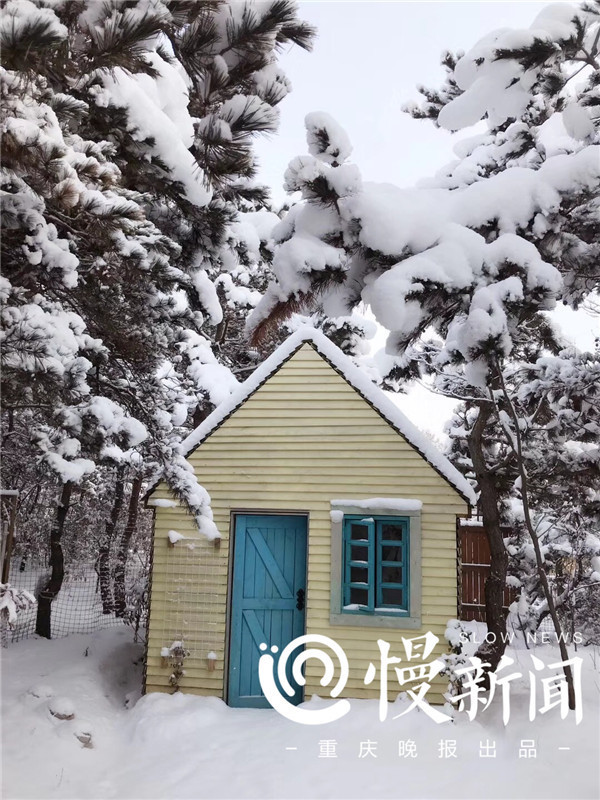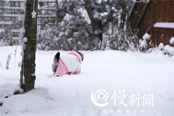 “山里第一场大雪是在12月4日,大雪将整个花园覆盖,树上、路上全是雪,门一推开,雪把大门都封了。我带着木鱼儿堆雪人,两条狗在雪中艰难前行,并打架争夺地盘,这一切都美得不可思议。”二木告诉上游慢新闻-重庆晚报记者,他制作了雪橇,给木鱼儿滑雪玩耍。后来又来了一群朋友,大家在花园里狂奔、拍照,真的是很快乐。