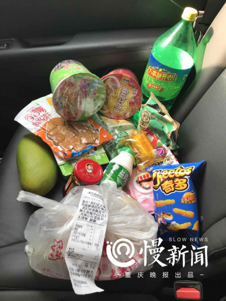邓小姐一行三人被困车上,吃外卖零食消磨时间