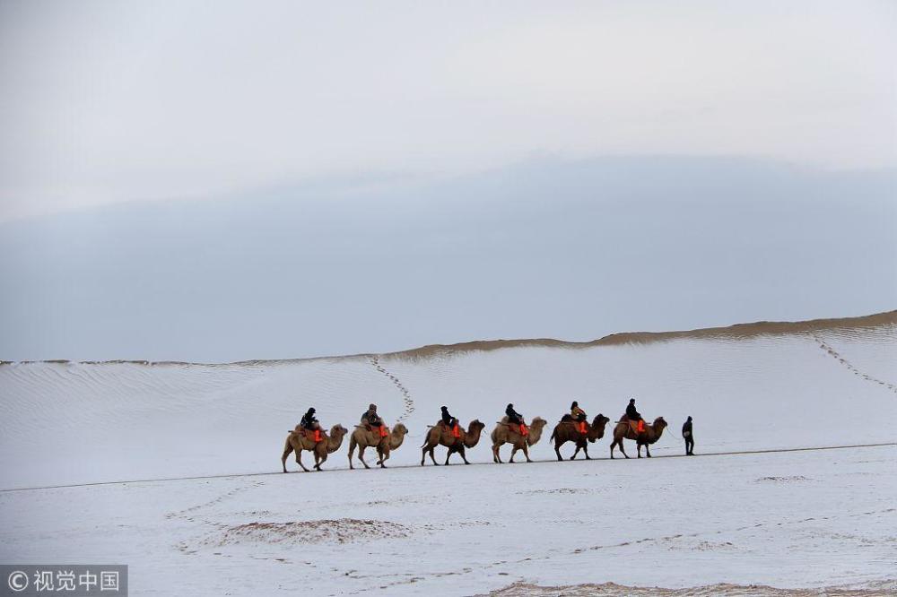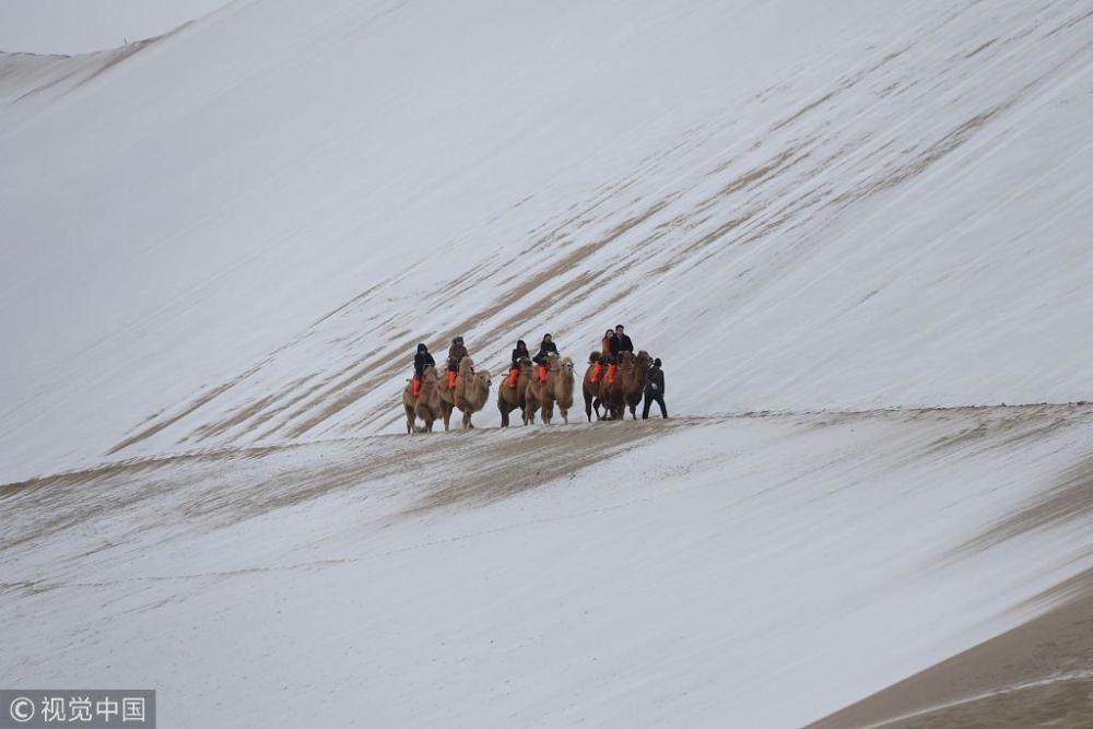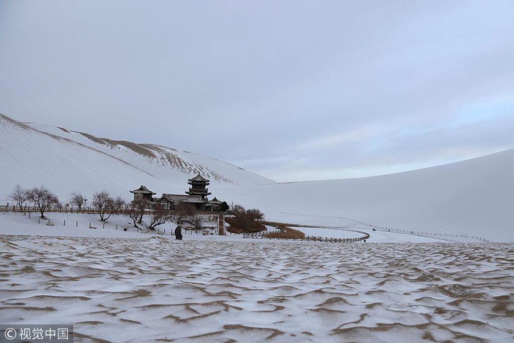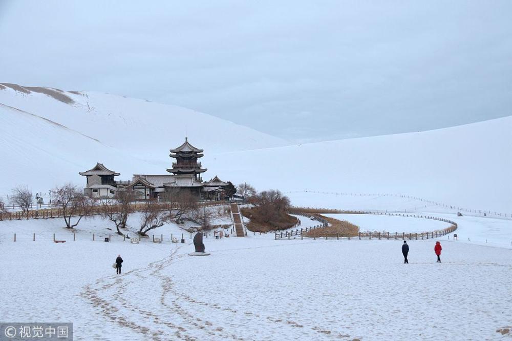降雪将敦煌市鸣沙山月牙泉景区装扮得银装素裹,分外迷人,景美如画。