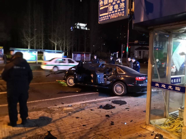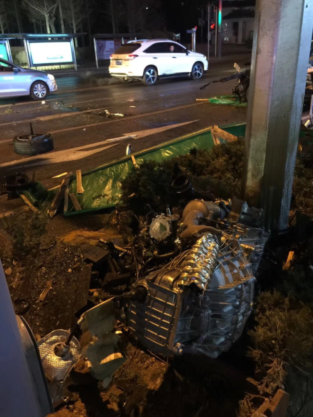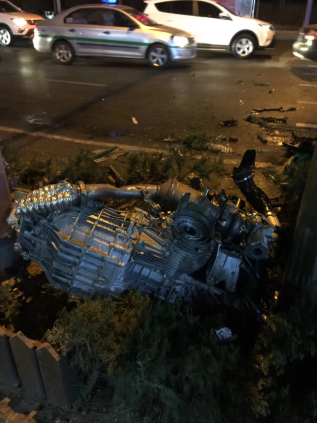 在这起事故中,奥迪轿车车损极其严重——车前机关盖被撞烂,车体扭曲变形了麻花状。气囊全部弹出。而车内的发动机甚至在巨大的冲击力下被撞得飞离车体,掉在10多米外的绿化带内。现场到处是奥迪车车身上的零件和撞击中的碎片。而被撞的电线杆早已断掉。