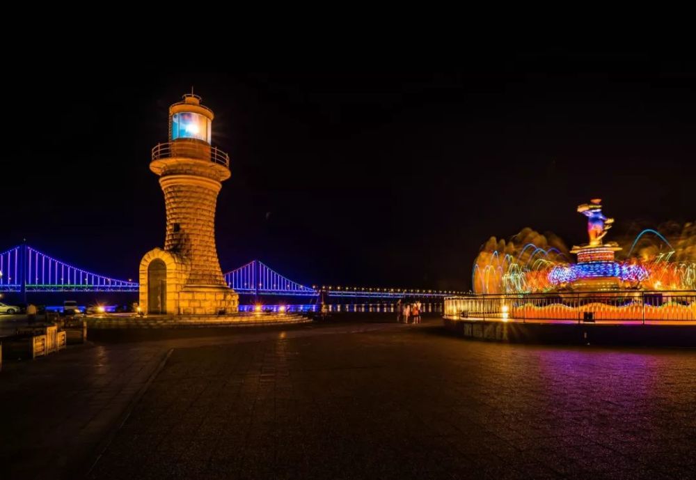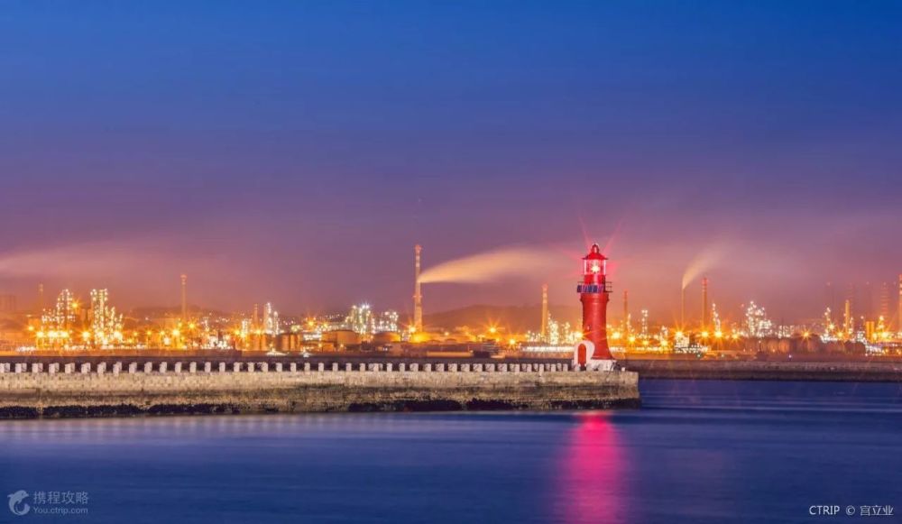 大连港有一红一白两座灯塔,夜幕下的碧海间,堤上红白两座灯塔异常醒目,如同一幅浪漫古典的油画。