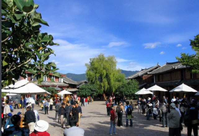 四方街,位于丽江古城中心,交通四通八达,周围小巷通幽,据说是明代木氏土司按其印玺形状而建。这里是茶马古道上最重要的枢纽站。明清以来各方商贾云集,各民族文化在这里交汇生息,是丽江经济文化交流的中心。