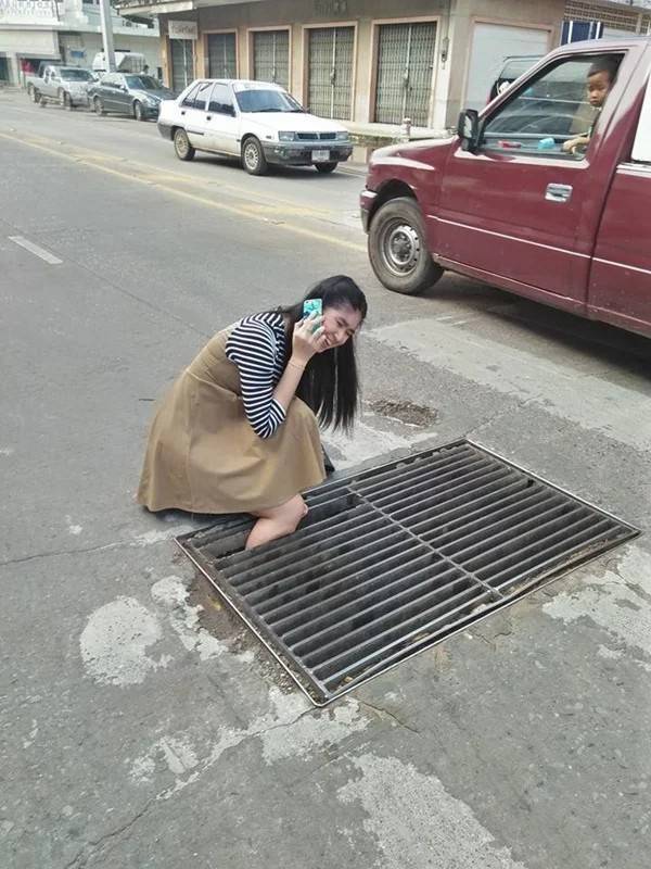据路人说,当时这个女孩走路时低头玩手机,结果一脚踩到下水道里。她非但不着急,反而当做笑话,打电话讲给朋友听。