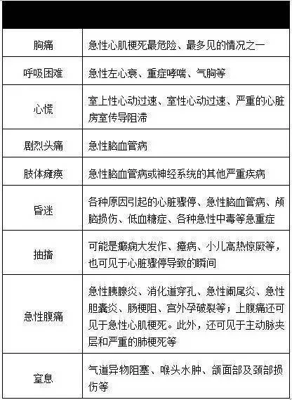 如血压突然急剧增高,可能会导致急性脑血管病、急性左心衰等;血压急剧下降,应考虑发生了休克。呕血可见于消化道溃疡、肝硬化食管胃底静脉曲张破裂,咯血可见于肺结核等,这些都可因出血而导致休克或窒息,继而危及生命。突然发生头晕、眩晕(感觉周围景物旋转或自身旋转),可见于急性脑血管病等。还有各种急性中毒、触电、溺水、自缢以及其它一些发病突然、症状明显、痛苦较大的紧急、严重情况。