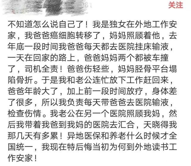 有的人尚在北上广打拼,面对父母生病且病得不轻、着实需要人照顾且自己没有兄弟姐妹的难题,欲哭无泪。