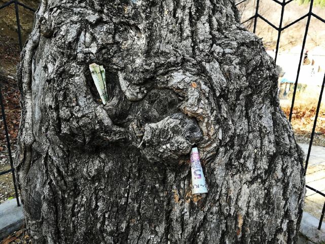来参观此树的游客把降龙木视为神树,树干周围被游客投放了很多钱币,用以祈福。