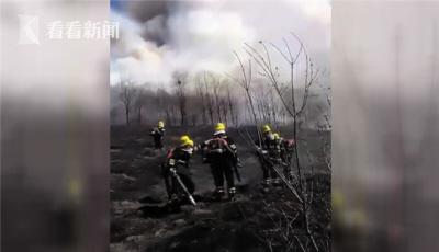 多位消防员身背风力灭火器正在扑火。据网络