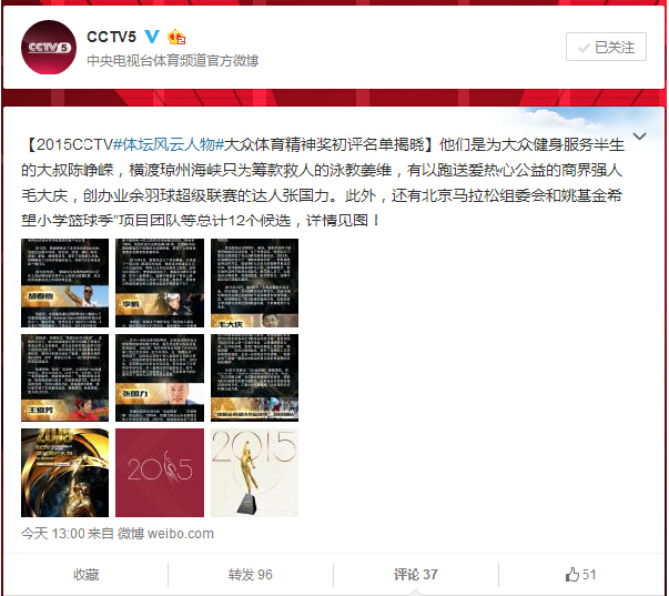 今(3)日,2015年CCTV体坛风云人物各奖项名单陆续揭晓。微博截图