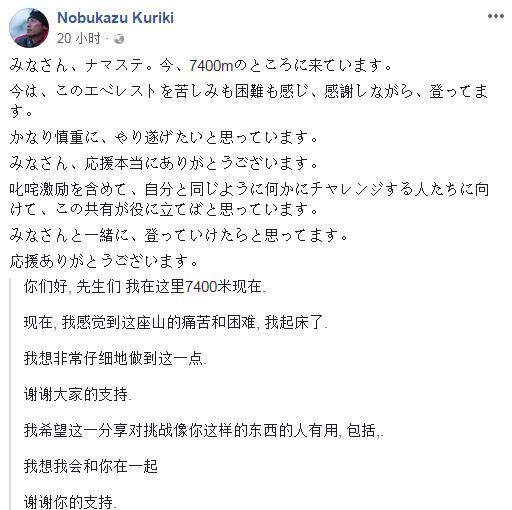 本次挑战珠峰前,栗城史多一直通过社交媒体更新动态,其中还透露自己在患有感冒的情况下继续坚持挑战, “我现在位于海拔7400米的位置。现在在这里,我觉得很痛苦,攀登很困难,但我在努力向上再向上。我想非常小心,”他写道。