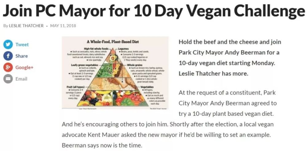 在当地的动物权益运动人士Kent Maur和市长交流,并让他吃素以成为帕克城的标杆后,这位新竞选为市长先生发出公告,称自己将步入为期10天(可能加长)的纯植物饮食生活方式。