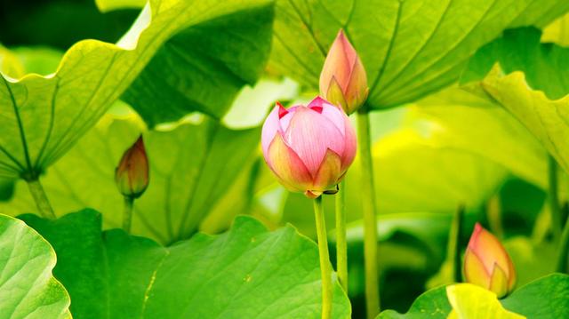 可能夏天太热的缘故吧,所以荷花躲在清澈凉爽的水中绽放,它的美丽也在波光中启幕。