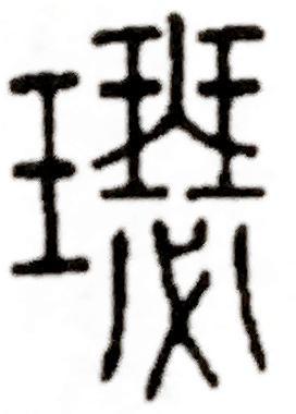 1、瓃。读作léi。《说文解字》释作:“玉器也。”线索极少,就是一种玉器。徐锴说,汉隽不疑瓃具剑饰也,谓鹿卢也。桂馥义证说:“是瓃为天子酒尊。”意思明白了,瓃原来就是天子用的酒具。字形上,一个玉字边,证明这个酒具是玉做的,右边一个畾(也读作léi)本义是田间的土地,因为土地要灌溉,为了防止水分流失,会在田地边缘和中间筑起边界,叫畾,这个字有时也加土,写作“壘”,有时也加草头,写作“藟”,意思相同,段玉裁认为畾是靁的省写,靁就是雷的繁写,而畾就是靁的古字,代表雷声连连,因此用到靁、雷时,可以写作畾,有时也写作雨字头下两个田的字形,如程邃的名作“布鼓雷门(是个成语,类似于班门弄斧)”。如图: