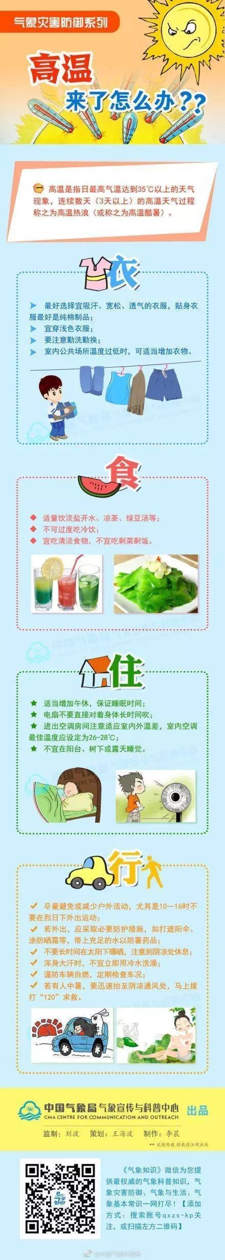 1、尽量避免午后高温时段的户外活动,对老、弱、病、幼人群提供防暑降温指导,并采取必要的防护措施;