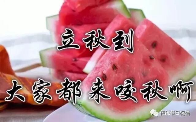 2吃西瓜“啃秋”在有些地方也称为“咬秋”。立秋这天吃西瓜或香瓜,据说可以不生秋痱子。北方吃饺子,时逢立秋,寓意圆圆满满。