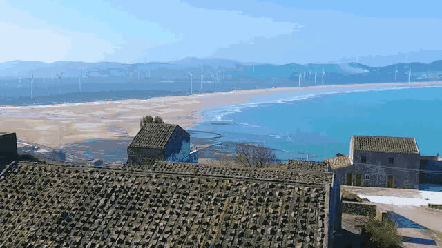 往前望可看见长江澳沿岸风车阵阵,海滩上闪动着银白色浪花,还有山间梯田高低错落、层层叠叠,彩色石厝如城堡般在山间连接成片。
