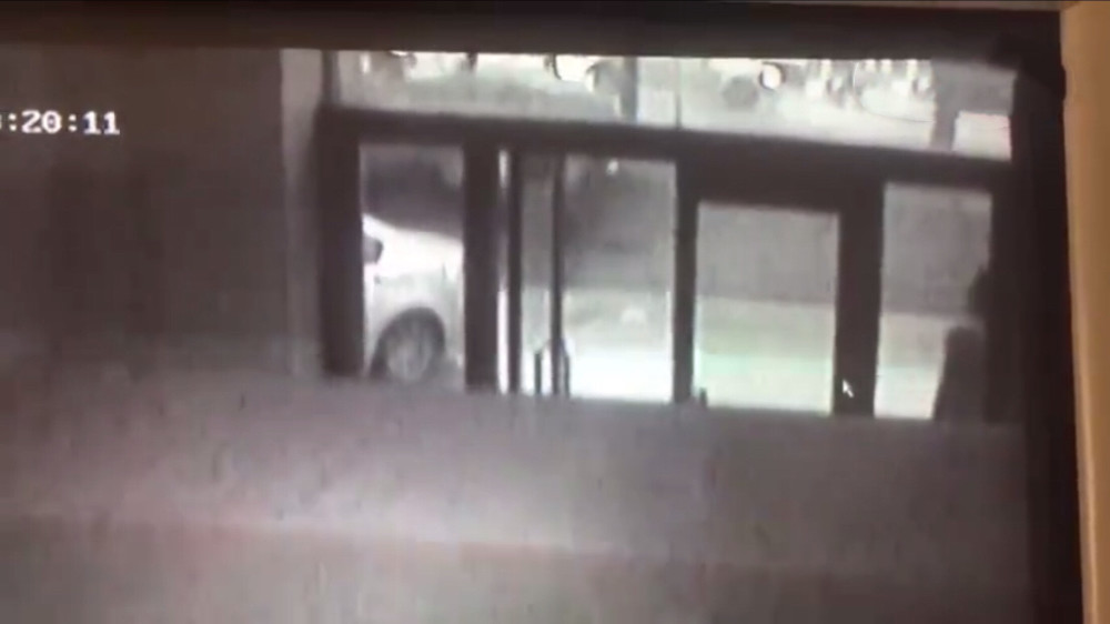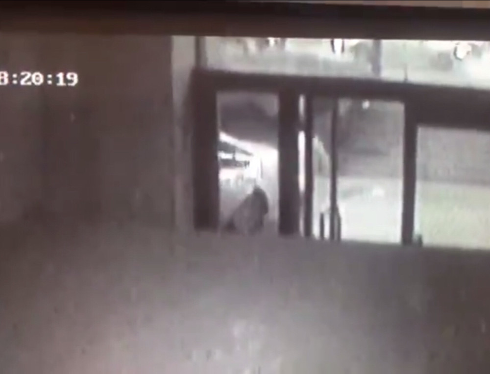 监控显示:事故发生时,公建门前有一名保安坐在门口值班,据悉他是这家单位的保安员。轿车冲下来时,保安险些被轿车撞上,挤在车体和大楼外墙之间,所幸保安员躲闪及时,逃过一劫。