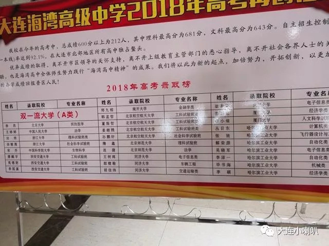 2018年,海湾中学600分以上212人,在大连市北部地区所有高中独占鳌头。