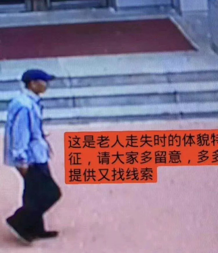 监控显示,老人走失时身穿蓝白相间长袖衬衫,深蓝色裤子,戴蓝色棒球帽,存在语言障碍。