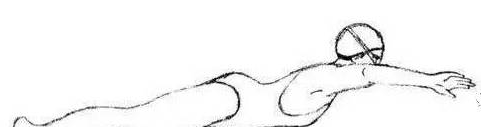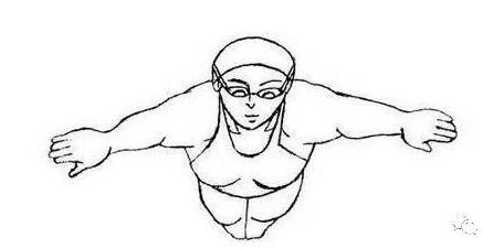 蛙泳时身体水平地俯卧在水面上,两臂向前伸直并拢,手掌张开,掌心向下,与水平面平行,身体处于自然伸直状态,头略低,水齐前额,脸下部浸入水中。稍收腹、微塌腰,身体纵轴于前进方向,保持身体的流线型。