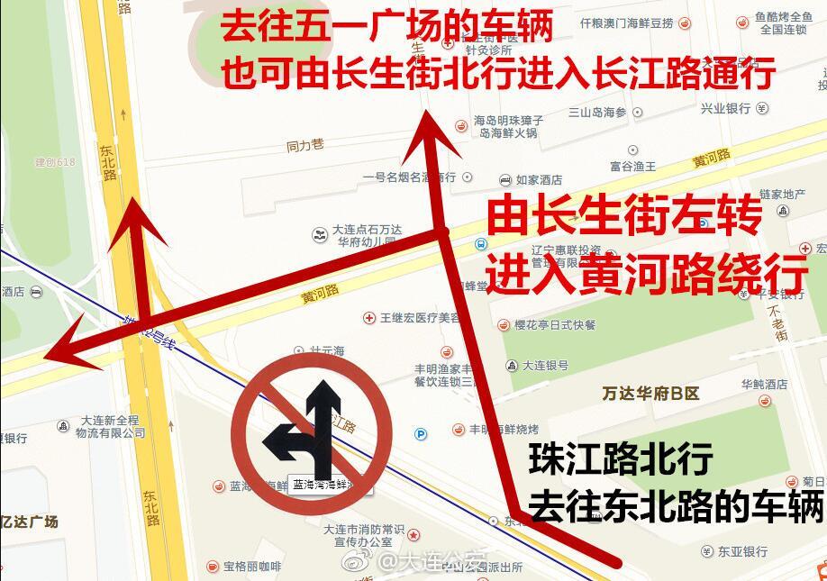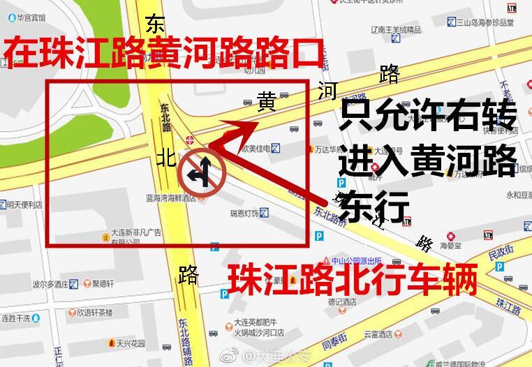 据大连交警,即日起,珠江路北行方向禁止驶入东北路,北行车辆在珠江路黄河路路口处只允许右转进入黄河路。