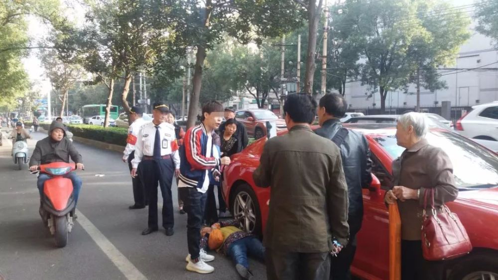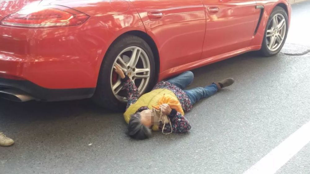 当天上午8点30分左右,郑州大学路与汝河路交叉口向北约100米路西的辅道内,停放着一辆红色保时捷跑车,一名白发老太太躺在车的右后轮处,左手死死抓住车轮。