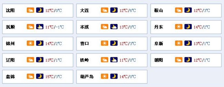辽宁省气象台预计:今天夜间到明天白天是晴有时多云的天气,最低气温沈阳、抚顺、辽阳、铁岭、朝阳、葫芦岛地区零下3℃到0℃,鞍山、本溪、丹东、锦州、营口、阜新、盘锦地区1℃到3℃,大连地区4℃到6℃。今天夜间海区西北风7到8级,阵风9到10级;大连地区西北风6到7级,阵风8到9级;丹东、锦州、营口、阜新、朝阳、盘锦、葫芦岛地区西北风5到6级,阵风7级。