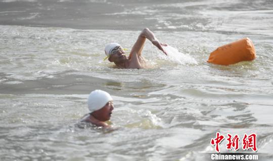 12月12日,兰州马拉松公园冬泳队队员“游”黄河。图为队员在水中游泳,当日水温低至4℃。 杨艳敏 摄