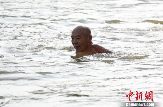 图为年纪最大的队员,年过八旬的周汉英在黄河里游泳。 杨艳敏 摄