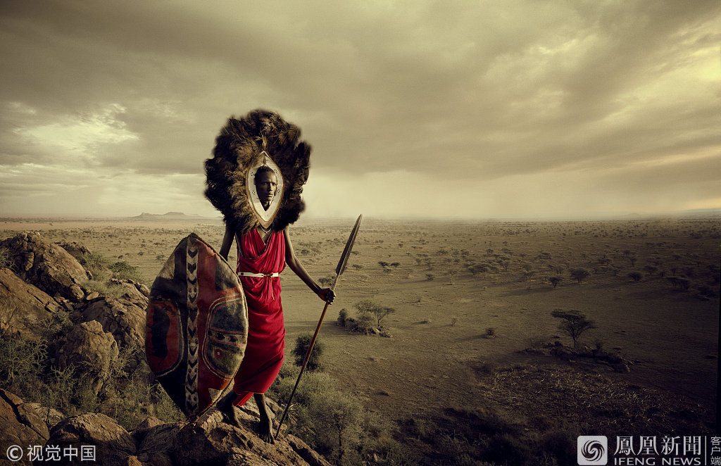 坦桑尼亚马萨伊部落(Maasai tribe)的一名成员拿着一把大皮盾和长矛,身着红色外套,头戴毛皮头饰,在沙漠中观赏风景。这个部落来自肯尼亚和坦桑尼亚,过着半游牧的生活。马萨伊部落以放牧牛群和勇猛的战士而闻名世界。